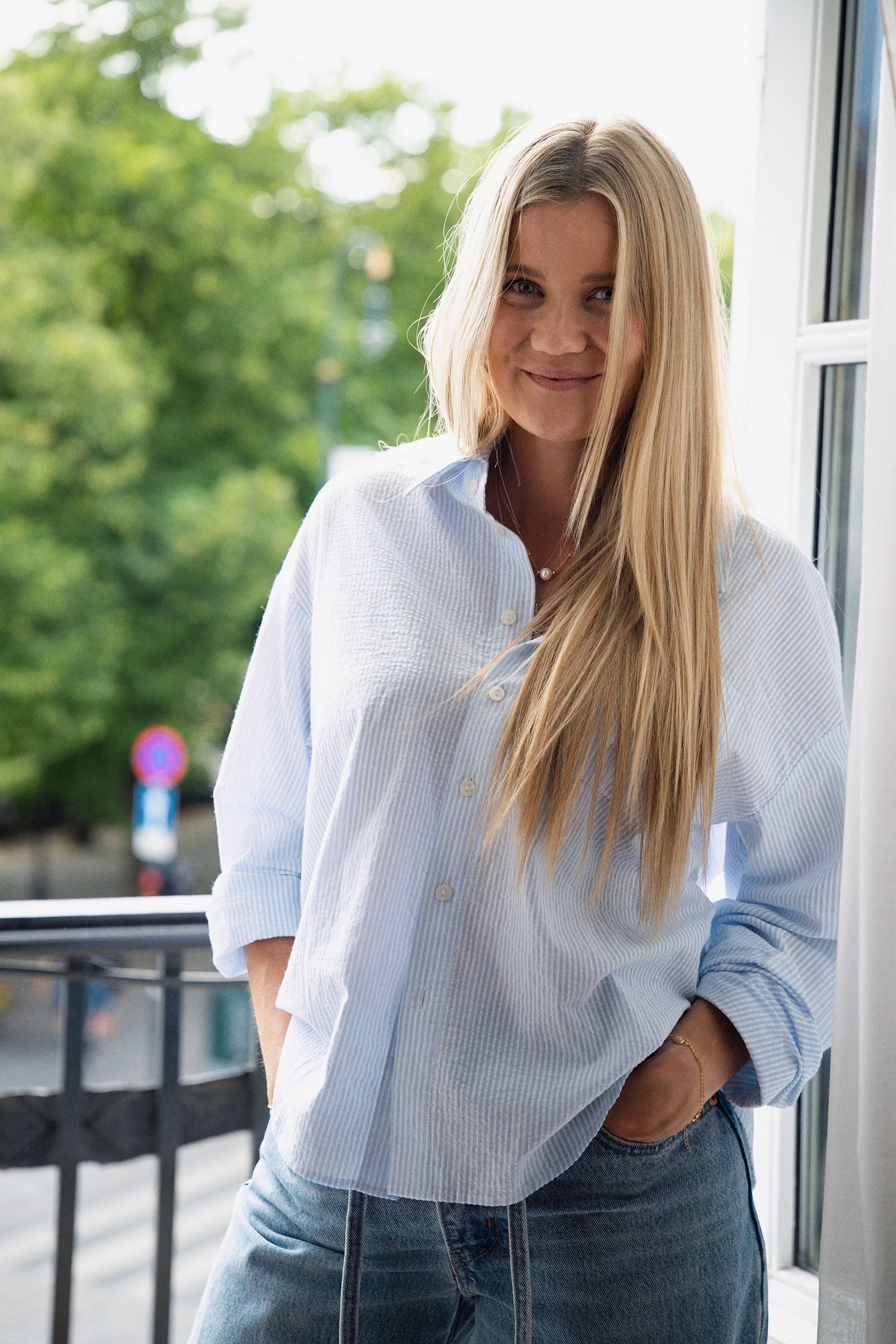 Lyng är en klassisk skjorta i tunn bomull med fina ränder i lavendel/vitt eller blått/vitt. Den avslappnade passformen och mjuka texturen gör den idealisk för varma dagar – oavsett om du stylar den till vardags, stranden eller på semestern.