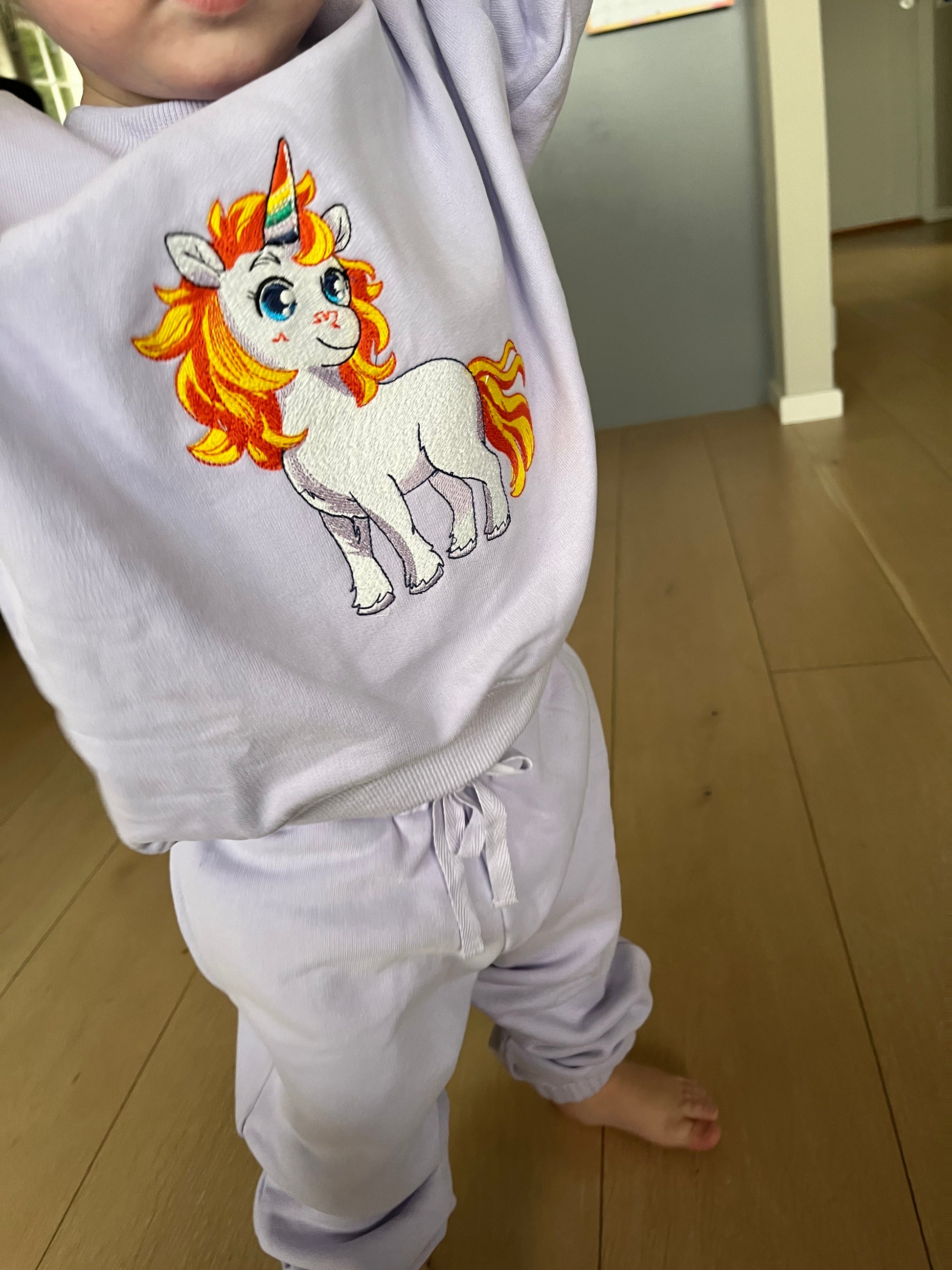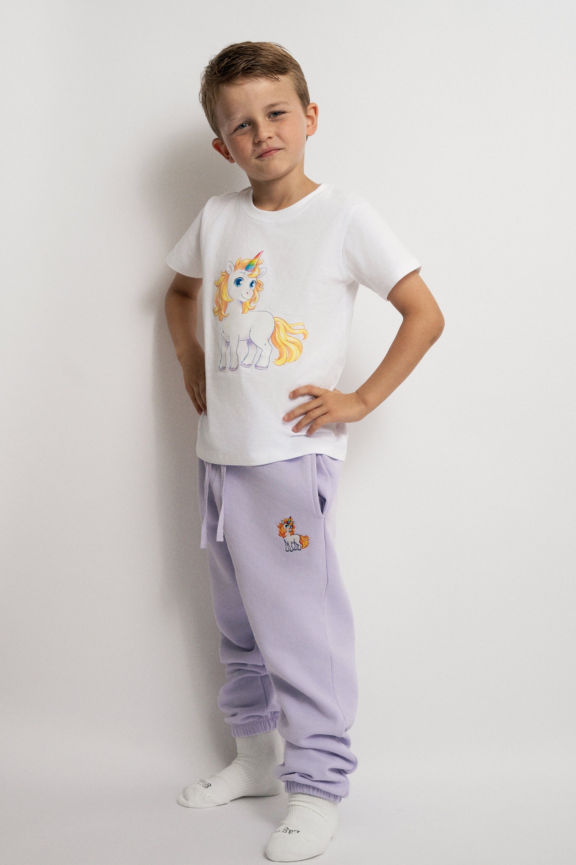 Corny, den magiska enhörningen som byter färg efter humör, gör dessa byxor till ett lekfullt och unikt inslag i garderoben.