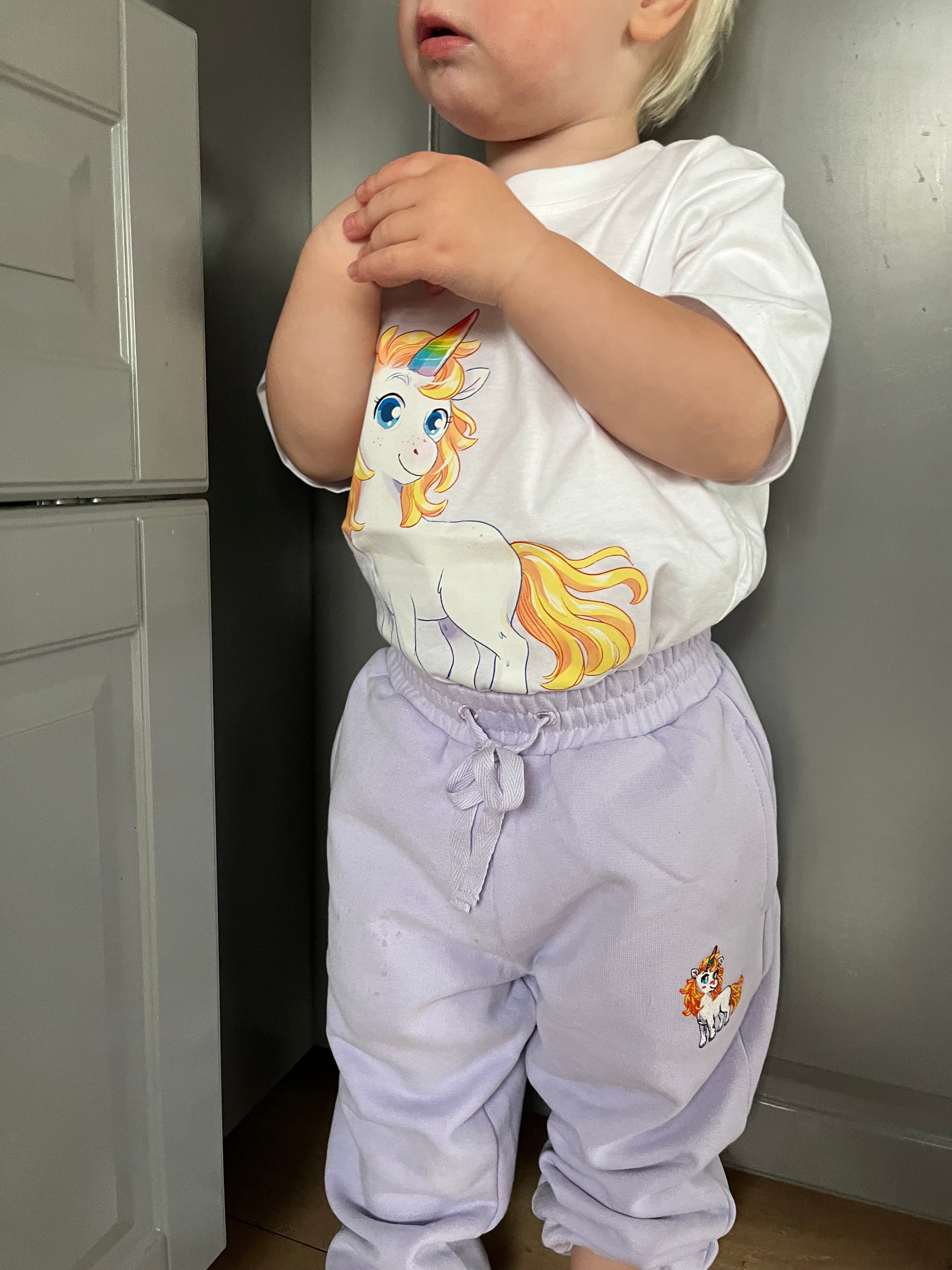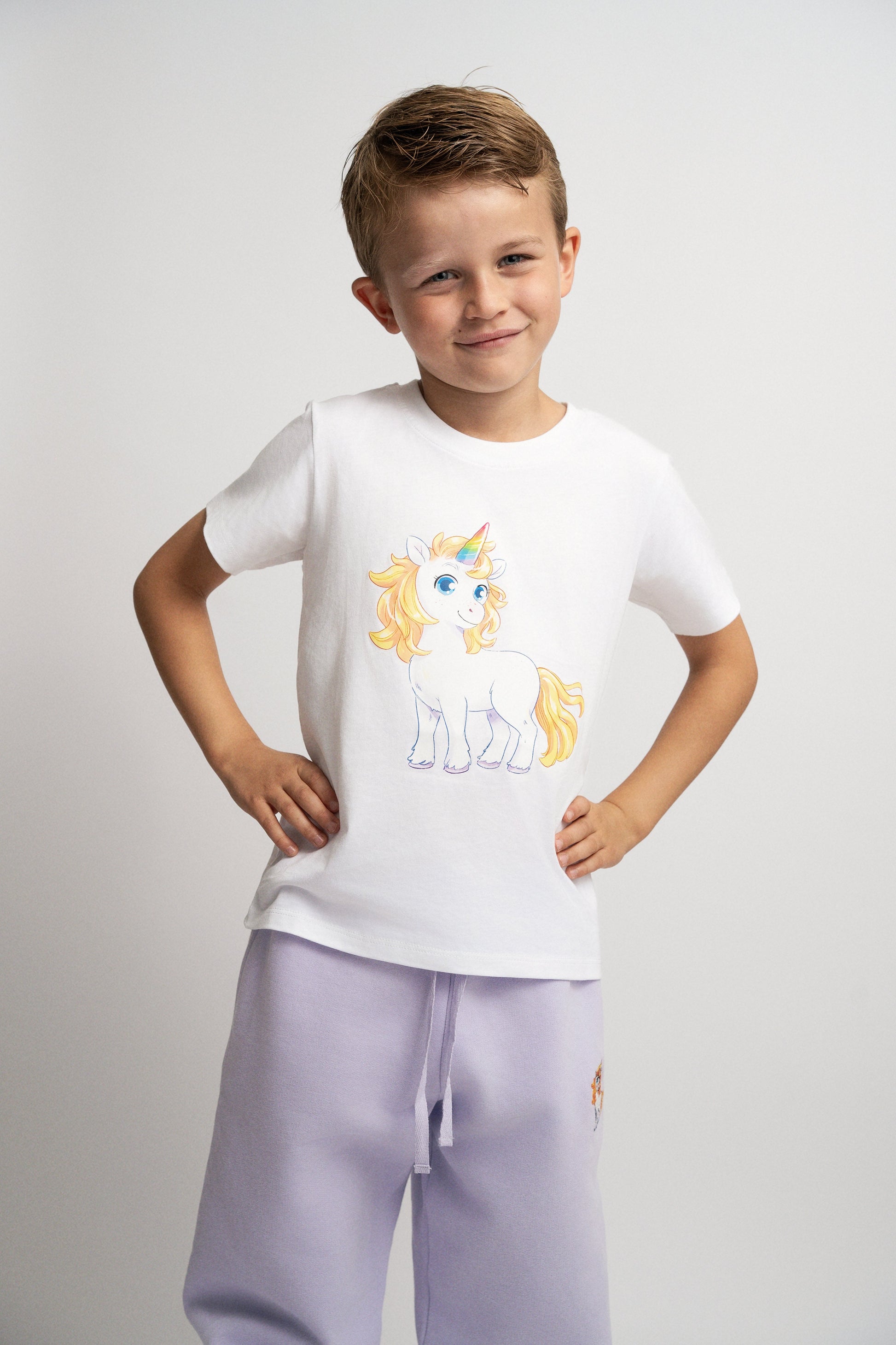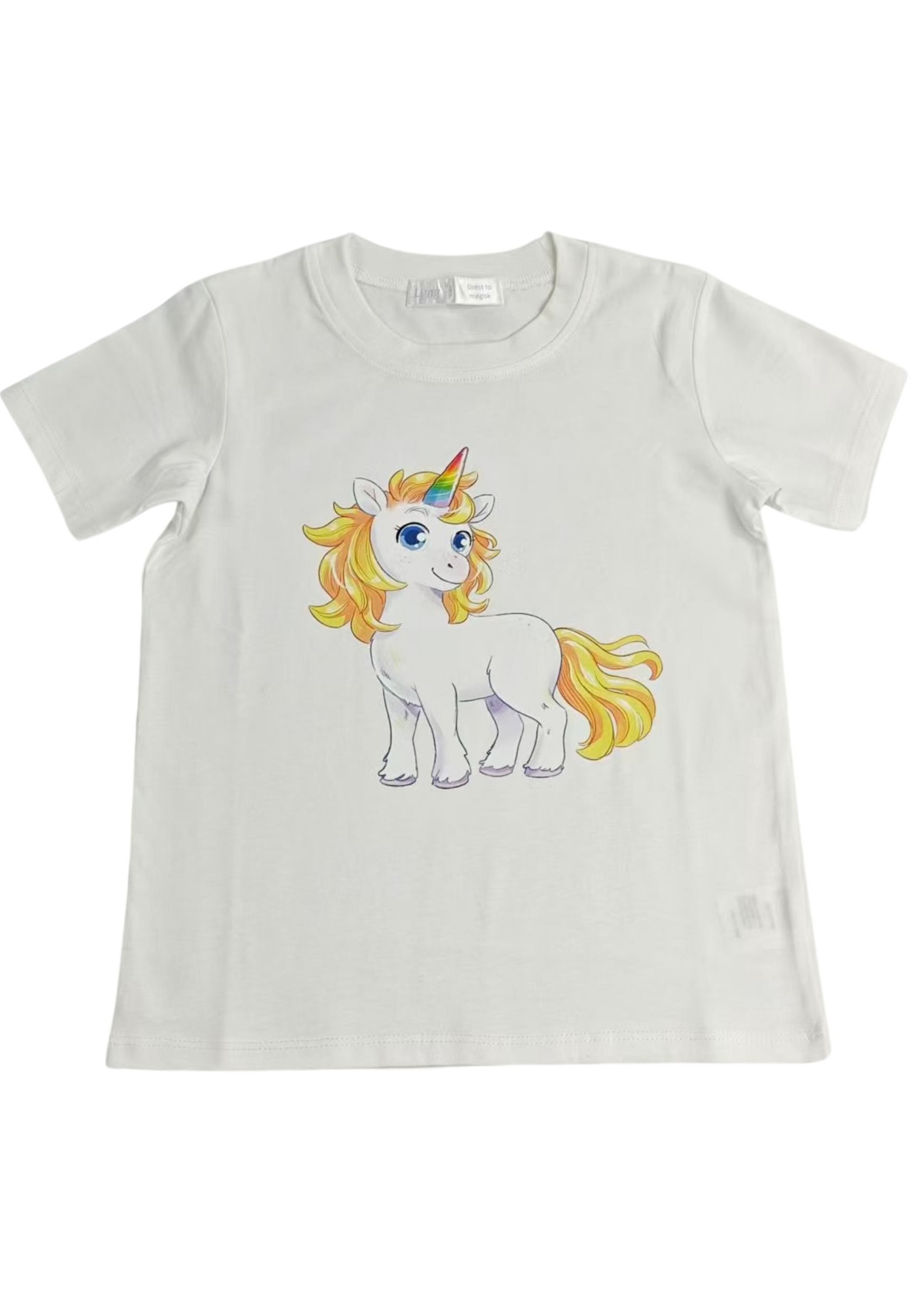 Med Corny, den magiska enhörningen som byter färg efter humör, blir denna vita t-shirt ett lekfullt och unikt inslag i barnets garderob.