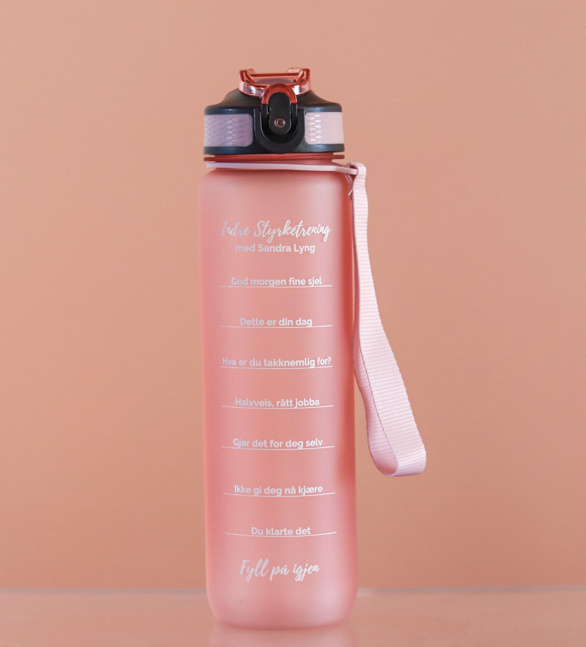 Läcker flaska med motiverande ord som hjälper dig att dricka tillräckligt med vatten under en dag. Vattenflaskan har en elegant design med motiverande norska ord och Indre Styrketrening-logotypen.
