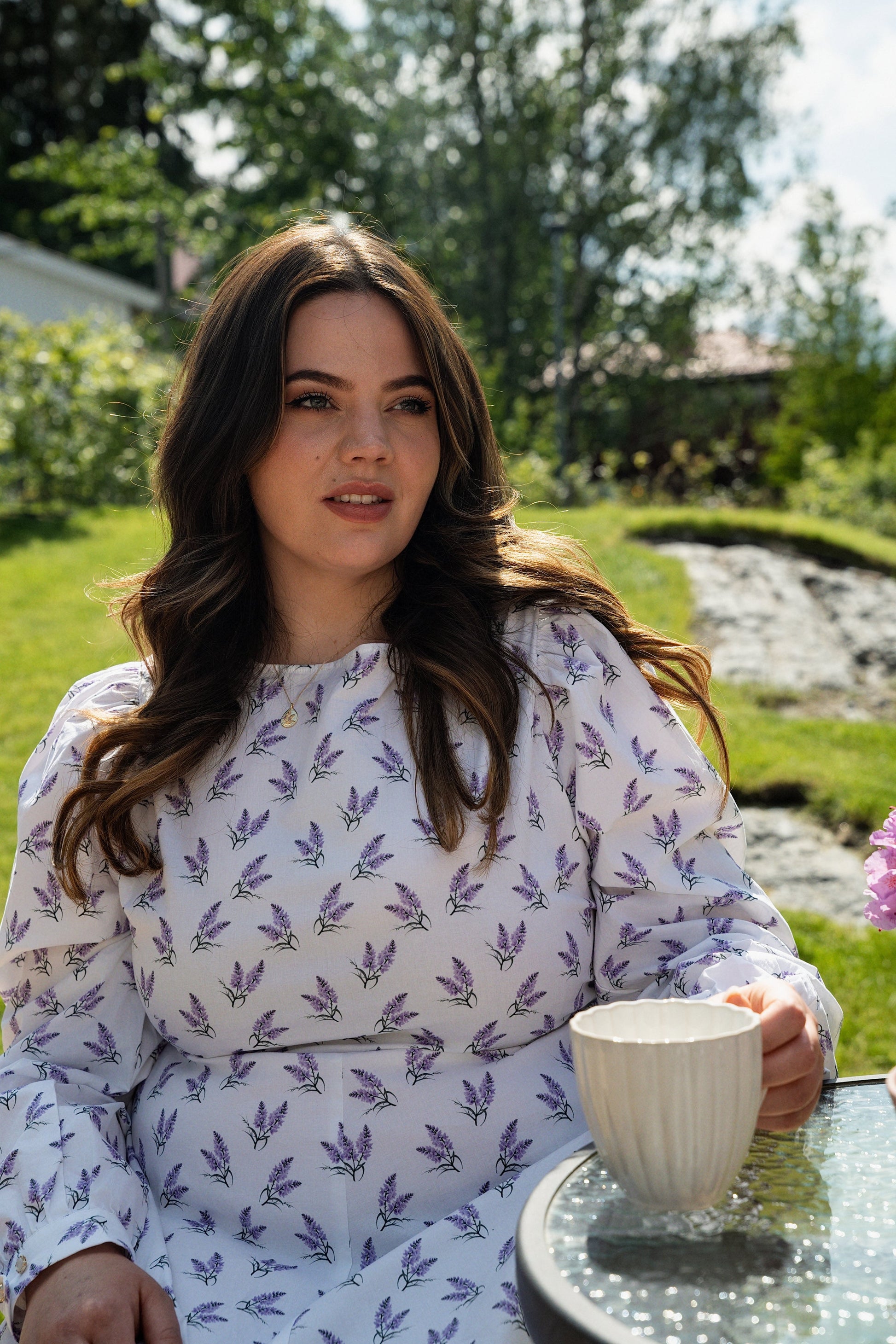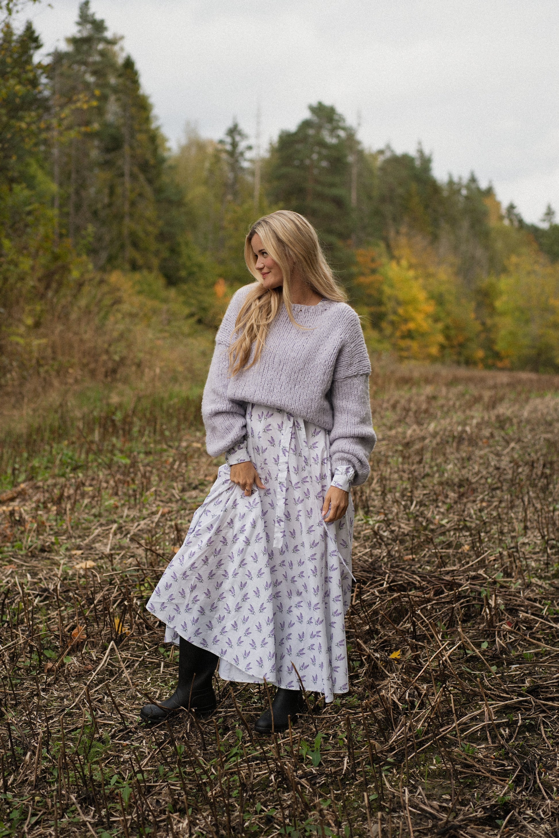 Klänningen är tillverkad av mjuk och andningsbar bomull som känns lätt och bekväm mot huden – perfekt för varma sommardagar eller med ull under på svalare kvällar.